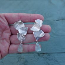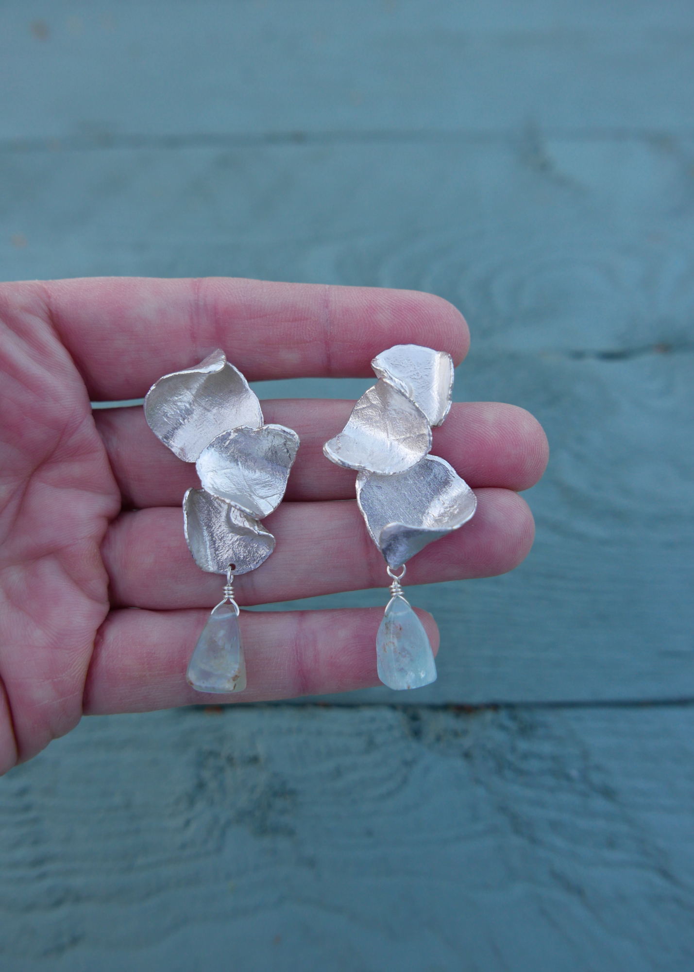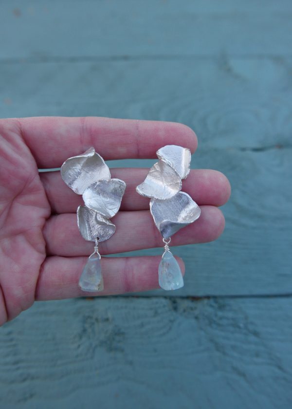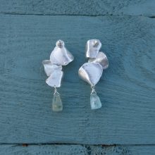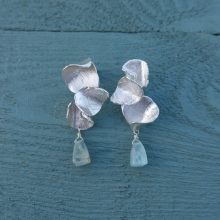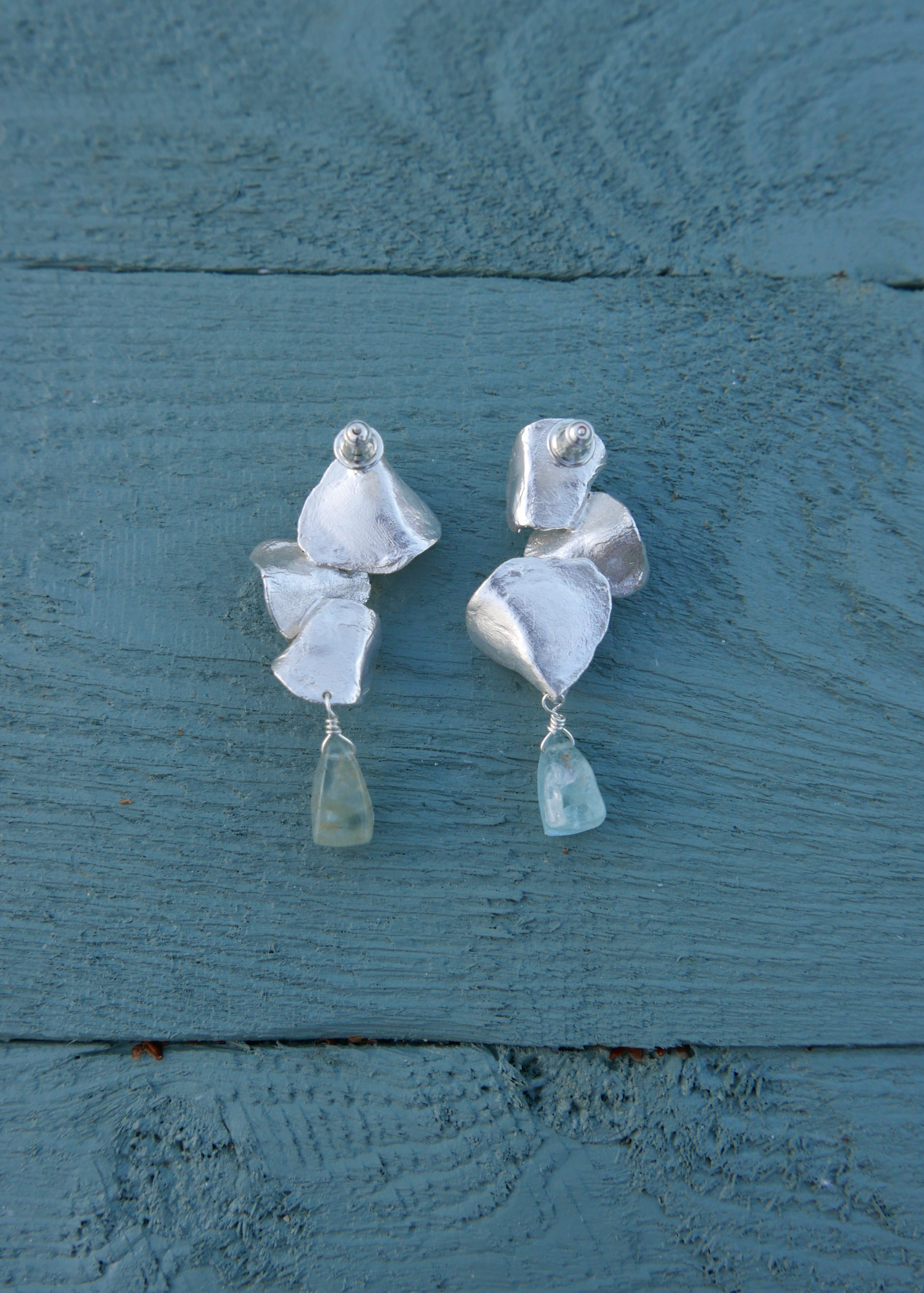 Curved and textured petals of silver, clustered into sculptural studs with vintage aquamarine drops.
