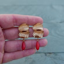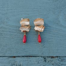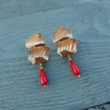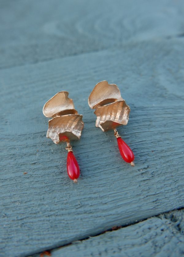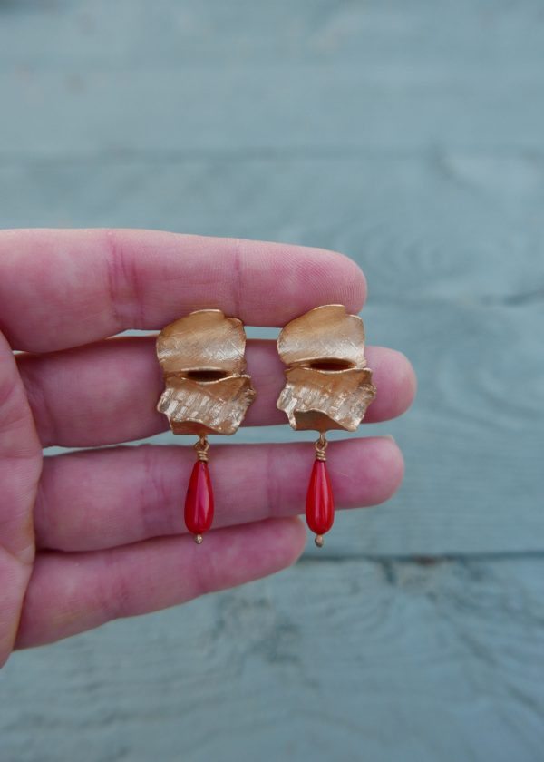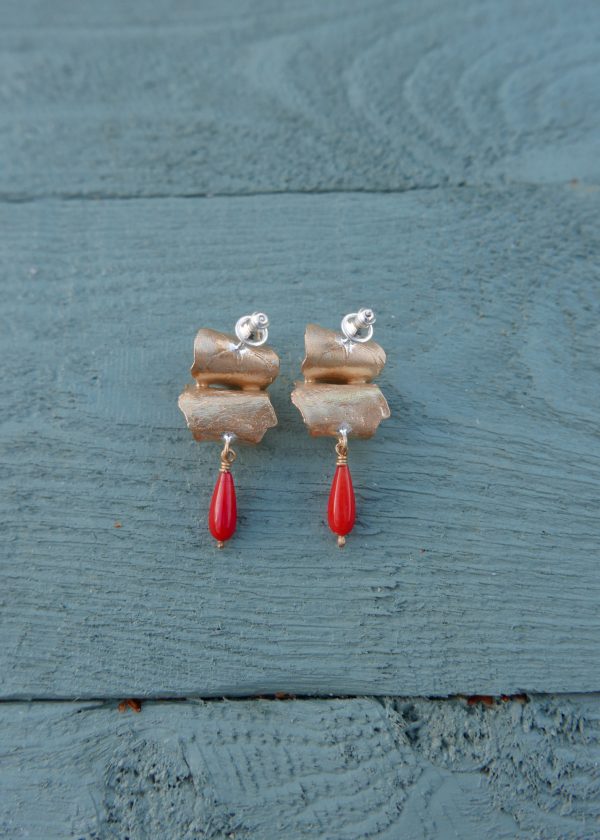 Curved and textured petals of golden bronze, clustered into sculptural studs with vintage coral drops.