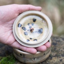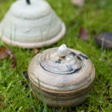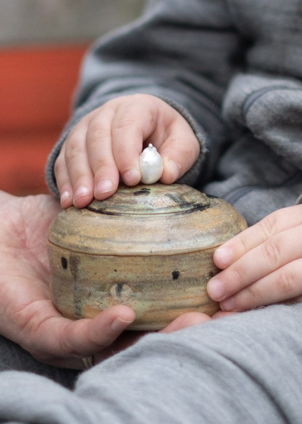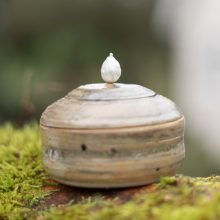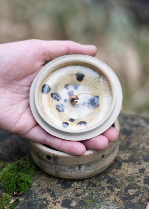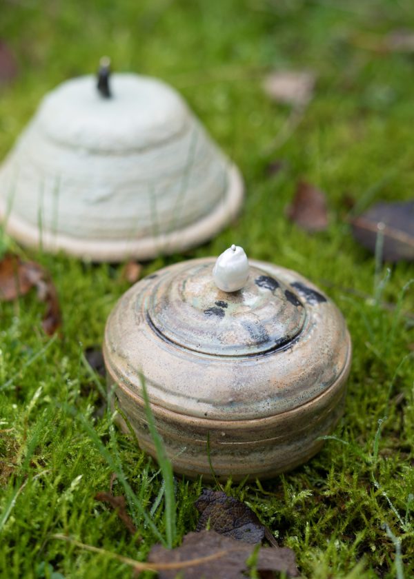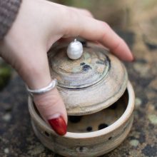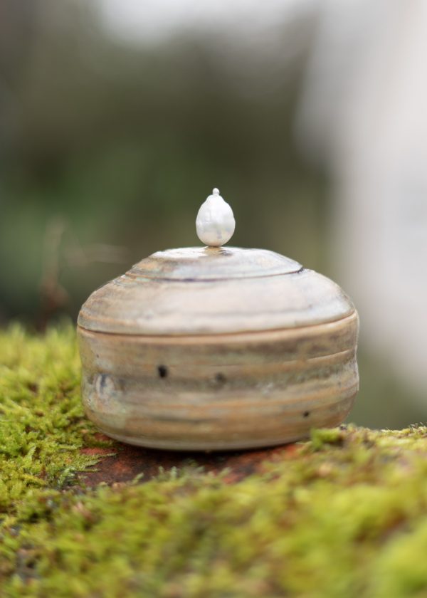 A collaboration with the wonderful Norfolk potter Cree and Clay. These one-of-a-kind lidded trinket dishes will keep your jewellery safe and free of dust while being a beautiful jewelled object in their own right. Keep next to your bed or your mirror, or wherever you put on or off your jewellery! Each one has a unique tactile shape and coloured glaze complemented by a Scottish agate or baroque pearl and sterling silver handle. All stones, pearls and metals are reclaimed vintage and recycled.