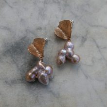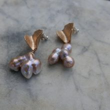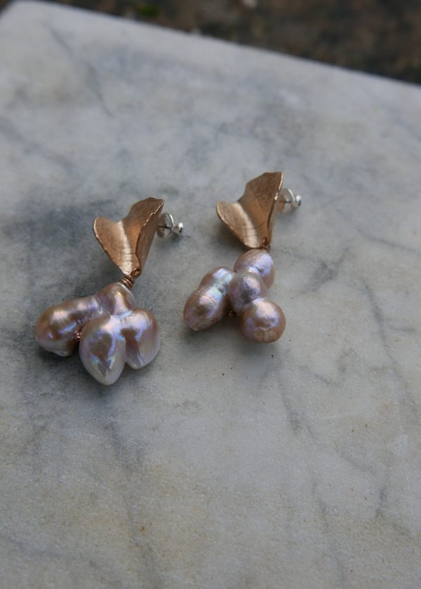 Playful vintage pink bobble pearls on textured and curved fen-foliage inspired golden bronze studs.